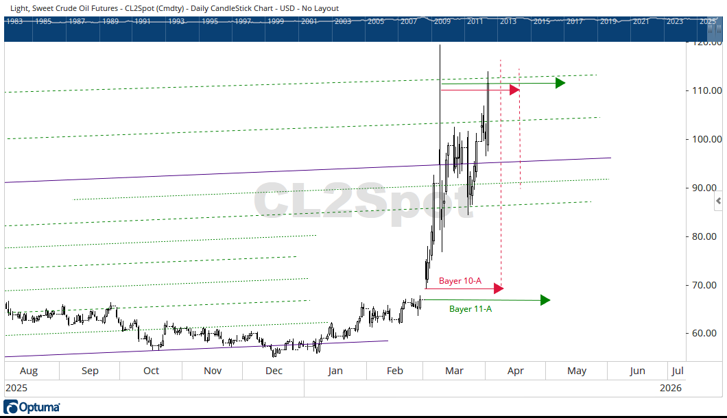 From the the price bar where Oil tested the $120 level on March 9, Rule 10-A says to watch for a price reaction point on April 17. Rule 11-A says to watch May 10.