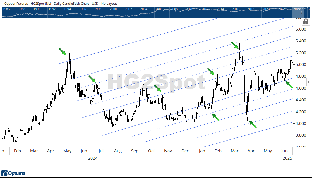 The following is a segment of the Copper futures chart with Jupiter quantum lines overlaid in blue color. The trend is bullish, but wickedly volatile. I have further annotated the chart to show the number of time when price hit a quantum line only to be pushed back. This is the Reiman topographic surface analogy with bumps and cavities.