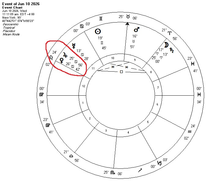 The geocentric zodiac wheel shows that on June 10, Jupiter and Venus will be at conjunction.