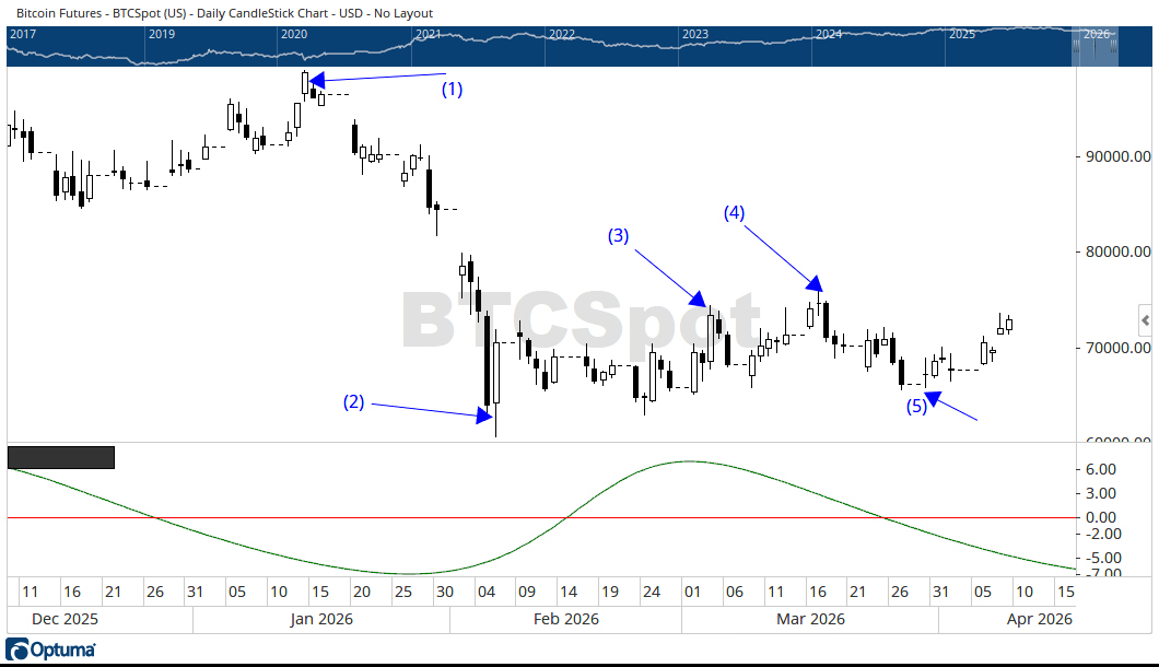 This is a chart of BitCoin futures. I have identified five pivot/swing points on the chart and numbered them (1) through (5).