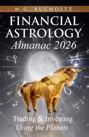 In my 2026 Financial Astrology Almanac I discuss how the distribution of the planets in our cosmos follows the Fibonacci Sequence pattern. I then show how very often price of a stock, commodity, or index will retrace by an amount equal to one of the Fibonacci ratios (38.2%, 61.8%, 48.6%, 78.6%).