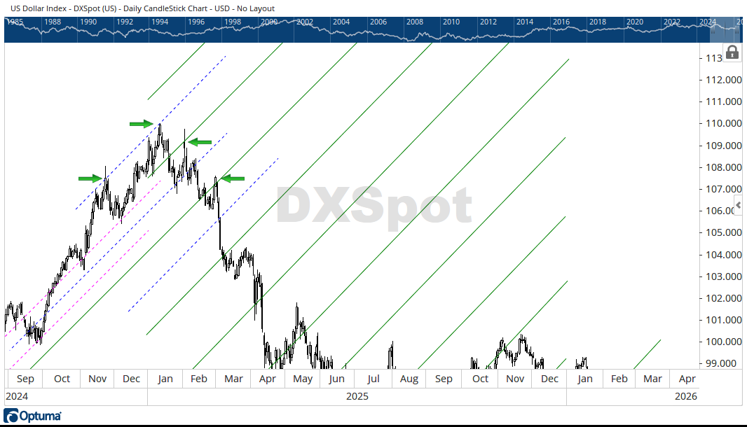 The following is a segment of the US Dollar Index with Jupiter quantum lines overlaid in green color. The quantum lines can be divided into smaller harmonics is so desired (blue dashed lines and pink dashed lines). Note how price in many cases tightly interacts with these various quanta… I have annotated the chart with some green arrows to illustrate this point.